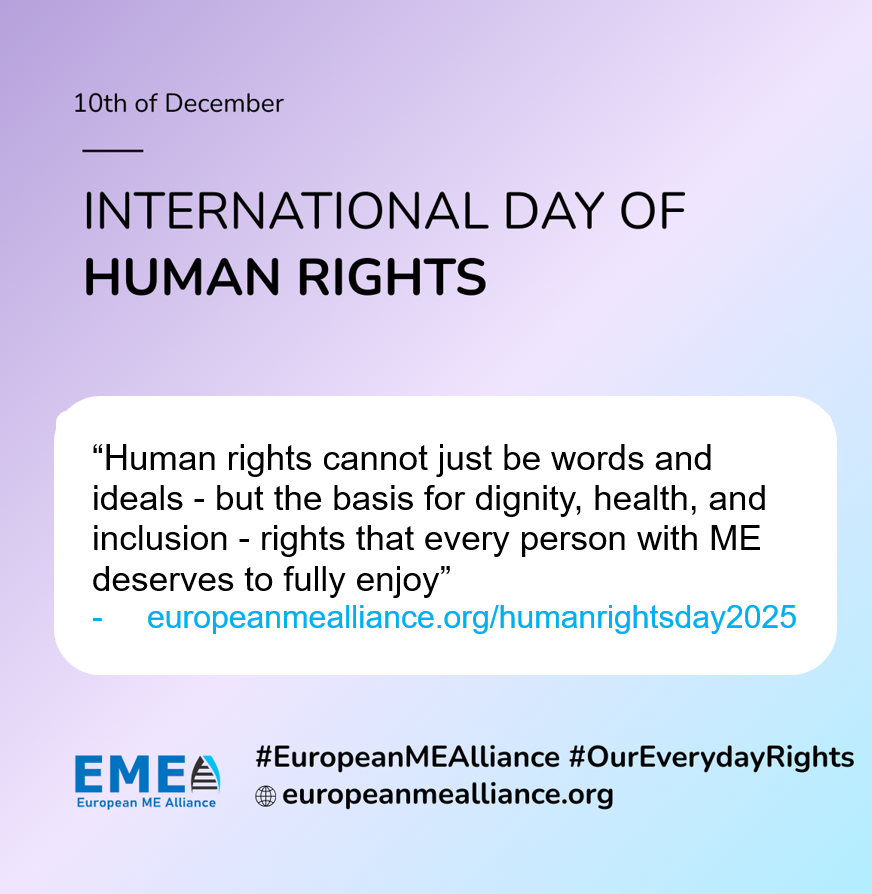 This article focuses on Human Rights Day 2025, highlighting how people with ME/CFS in Europe continue to face barriers to diagnosis, treatment, and social inclusion. It explains how these challenges breach fundamental human rights and calls for greater recognition and action to uphold the rights of those affected.